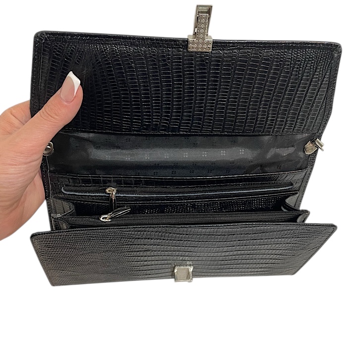 با این کیف در مهمونی ها بدرخش کیف مدل صنم با یک زنجیر شیک به صورت دوشی درمیاد و در طرح لیزارد تولید میشه ظرفیت این کیف فوق العاده هست و فضای داخلش 5 قسمت مجزا د اره دو جیب زیپ دار داره و به راحتی می توانید گوشی داخل کیف بگذارید 6 جای کارت داره و 2 جای البوم داره گذاشتن پول نقد بدون تا خوردگی و فوق العاده با کیفیت و مجلسی