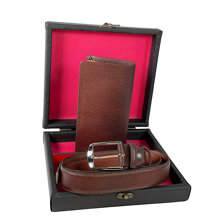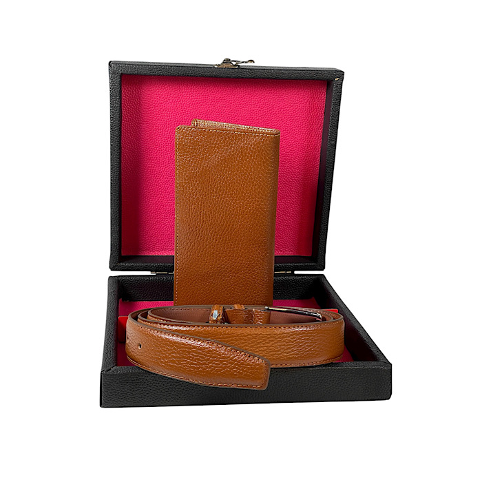 ست دو تیکه چرم طبیعی که شامل کیف کتی و کمربند میشه و توی یک باکس شیک چرمی براتون ارسال میشه ومناسب هدیه دادن هست کیف کتی چرم طبیعی هست که 13 فضا برای کارت های شما ویک فضا برای اسکانس و پول های نقدی شما دارد داخل کیف کتی یک فضا برای البوم شما و یک فضا برای موبایل طراحی شده و موبایل تا ارتفاع 17 سانت داخلش جامیشه کمربند این ست چرم گاوی هست